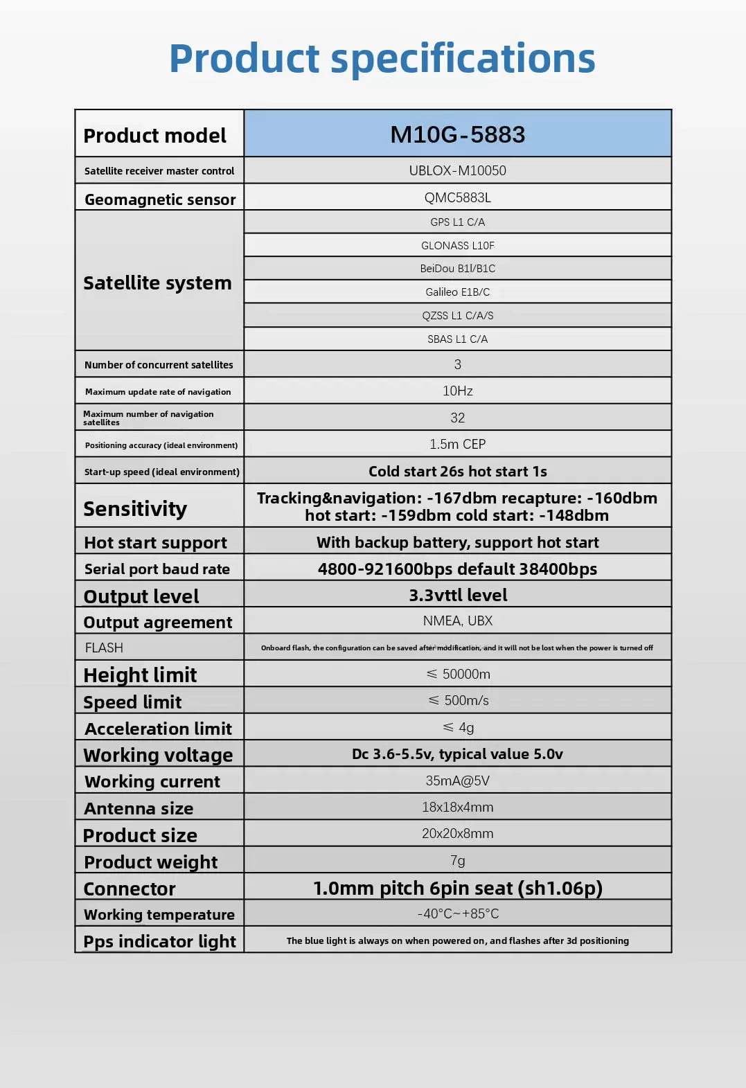 تعتمد وحدة M10G-5883GNSS على أحدث جيل من شريحة Ublox M10، التي تتميز بأداء قوي وسرعة بحث فائقة عن النجوم. يمكنها استخدام ما يصل إلى 32 قمرًا صناعيًا، وتتميز بدقة تحديد المواقع. يبلغ حجم مستشعر البوصلة الجيومغناطيسية QMC5883L المدمج عالي الأداء 20 × 20 × 8 مم فقط، وهو صغير الحجم وسهل التركيب. كما أنها مزودة بهوائي مستورد عالي الأداء وصغير الحجم، بتصميم مدمج دون أي تأثير على الأداء. وزنها خفيف للغاية، حيث يصل إلى 7 جرامات، مما يجعلها مناسبة جدًا للآلات الصغيرة التي تسافر عبر الزمن، والآلات الدائرية، والأجنحة الثابتة خفيفة الوزن.